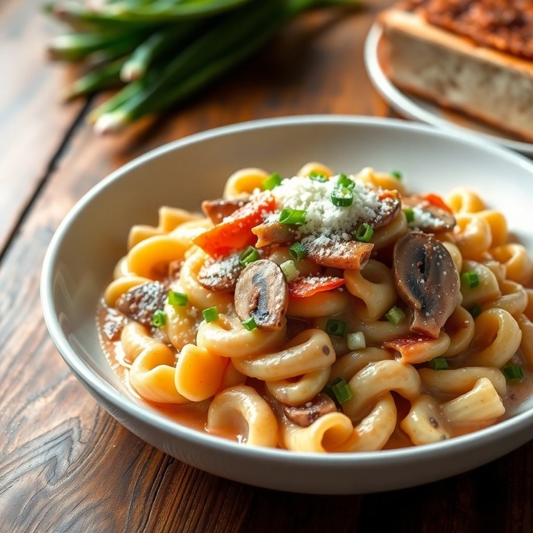 Una deliciosa pasta fusilli mezclada con media crema, jamón, champiñones salteados y cebollín, ideal para una cena rápida y reconfortante.