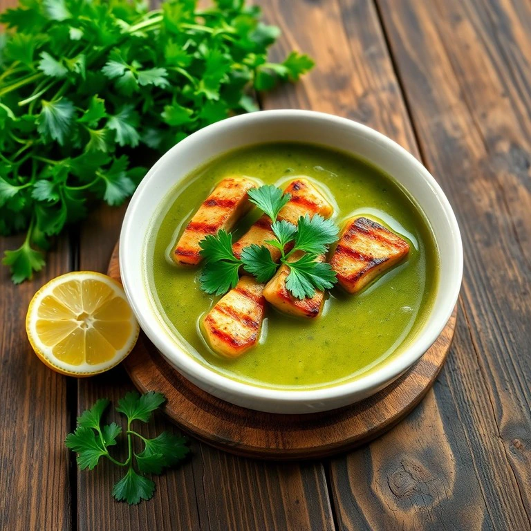Sopa reconfortante de berro con trozos de pollo marinado en especias, perfecta para un almuerzo saludable.