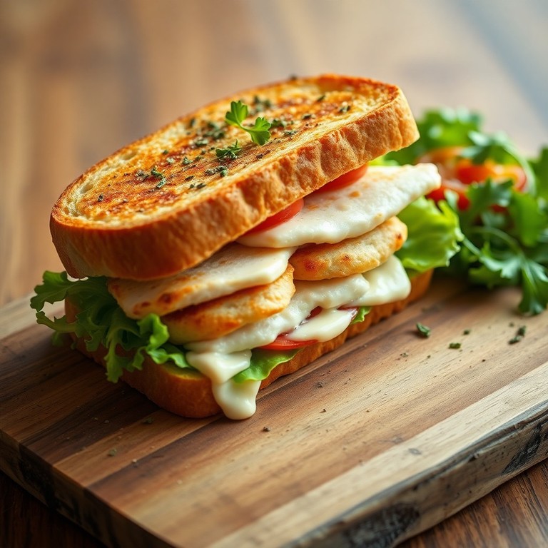 Elevate your lunch with this delectable toasted chicken sandwich featuring tender grilled chicken, creamy homemade herb mayo, and a hint of fresh herbs, all served on artisanal bread. Perfect for a quick yet gourmet meal, now without mustard for a milder flavor.