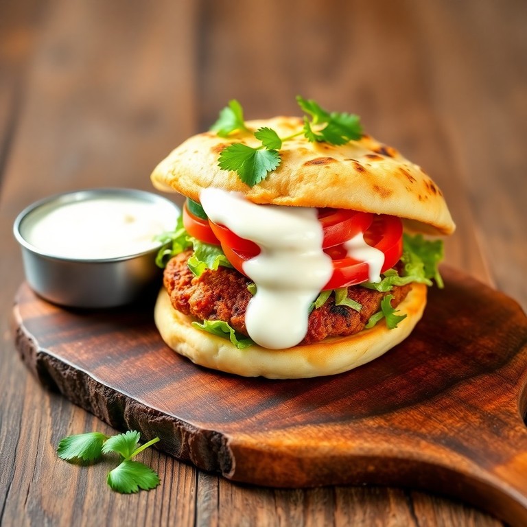 A fusion delight featuring a juicy spiced patty nestled between warm naan bread, topped with cool yogurt sauce and fresh veggies. Perfect for grilling enthusiasts seeking something new!