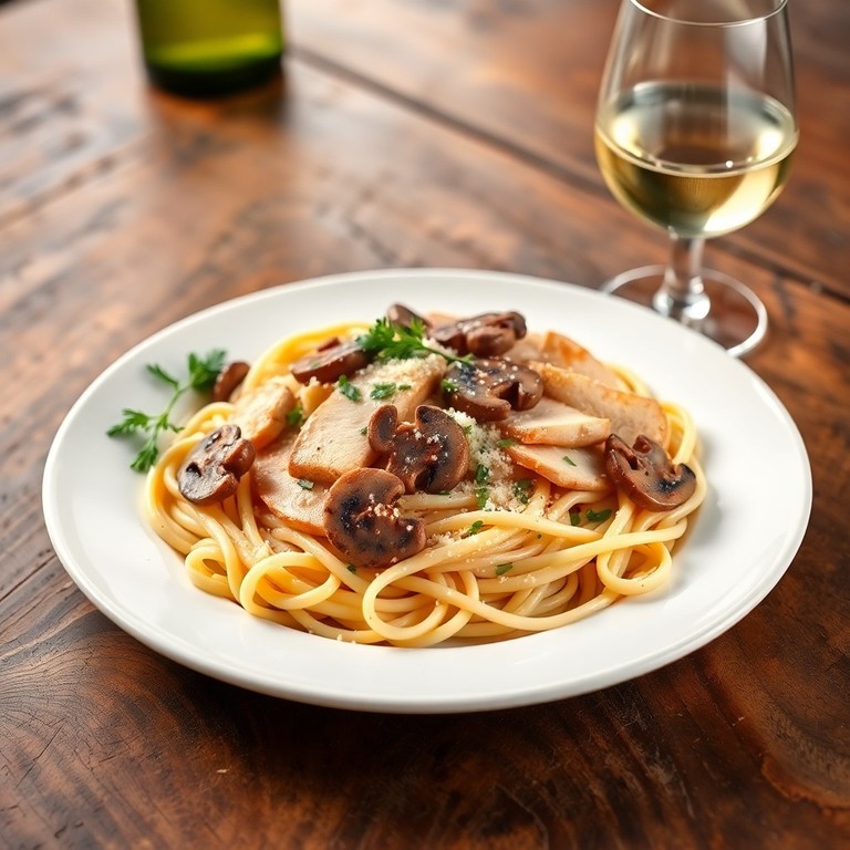 Una deliciosa pasta cremosa con pollo a la parrilla, champiñones salteados y un toque de vino blanco, perfecta para una cena elegante en solo 30 minutos.