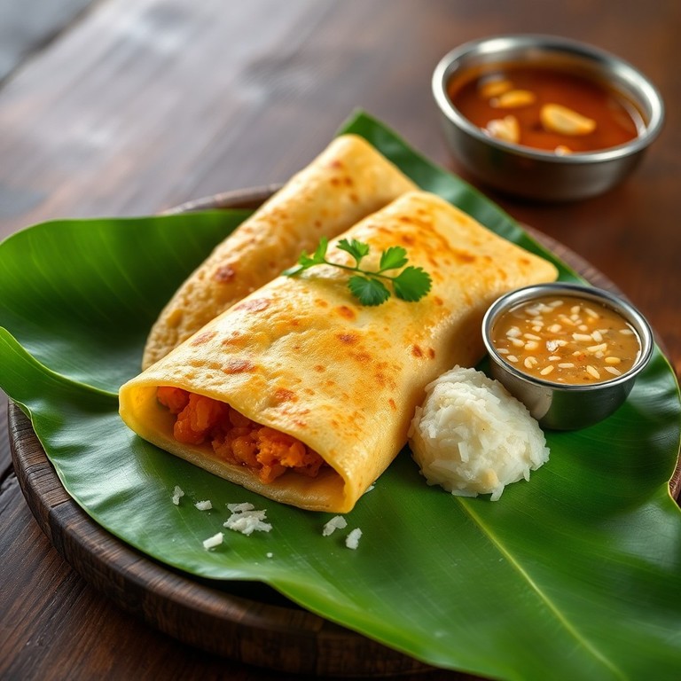 A flavorful South Indian dosa, featuring a spiced potato filling and a rich Mysore-style chutney, all made without onion and garlic.