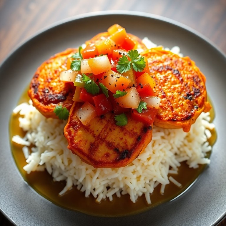 Crispy potato cakes infused with ginger, garlic, and chili, served over a bed of fluffy rice and a vibrant tomato-onion salsa. A flavorful and texturally exciting dish.