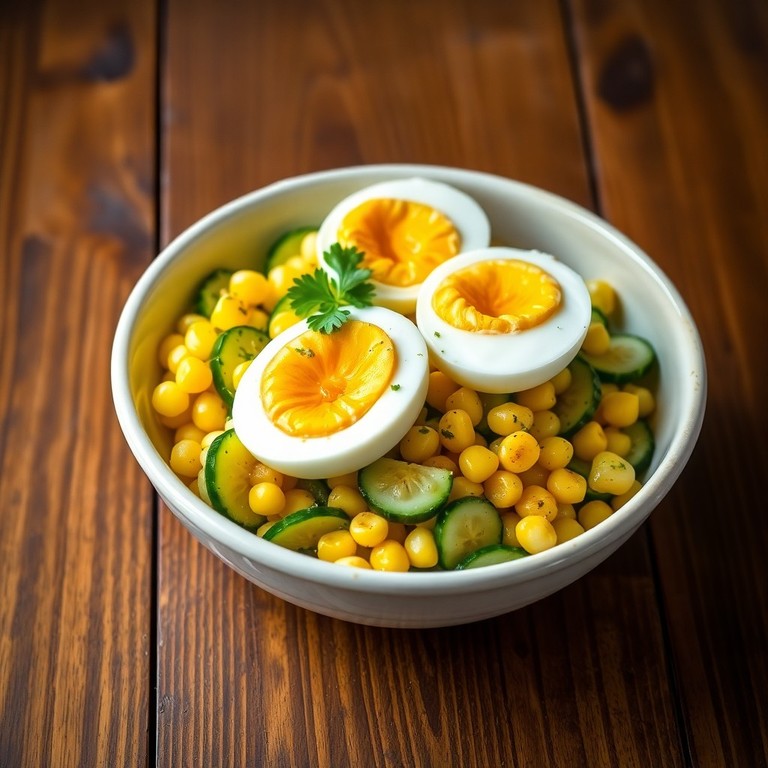 A vibrant and healthy salad with grilled corn, sliced cucumber, and soft-boiled eggs, tossed in a lemon-herb vinaigrette. Perfect as a light lunch or side dish, packed with flavor and nutrients.