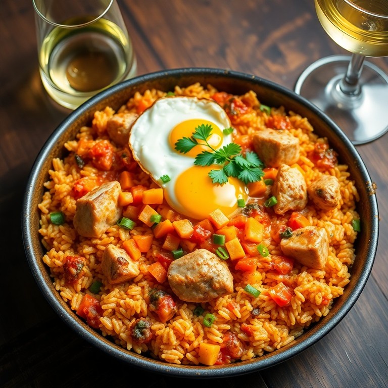 Una deliciosa variación de la paella, con pollo marinado en especias, arroz bomba, sofrito de tomate y verduras, y un huevo frito para coronar.