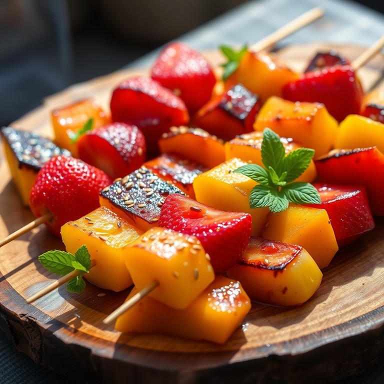 Brochetas de frutas caramelizadas a la parrilla con un glaseado de miel y limón, espolvoreadas con semillas de sésamo tostado. Una deliciosa y elegante opción para postres o barbacoas.
