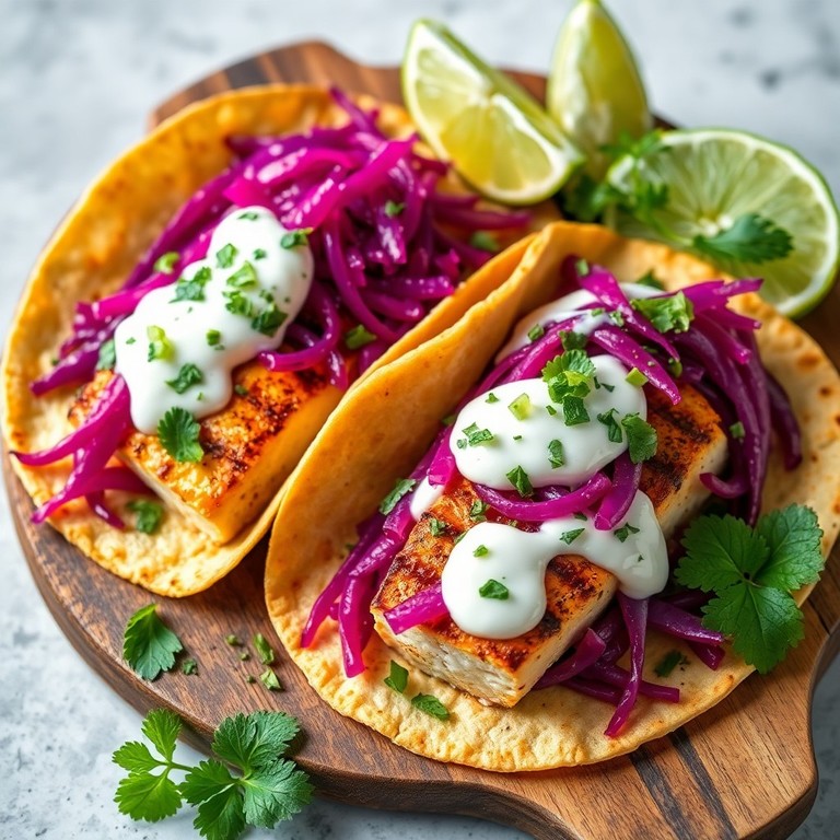 Tacos de Bacalao a la Plancha con Col Lombarda Encurtida y Salsa de Yogur y Hierbabuena