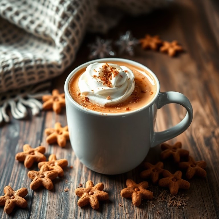 Un café au lait réconfortant infusé avec des épices de spéculoos, garni de crème fouettée à la vanille et d'un crumble de biscuits pour une boisson gourmande parfaite pour l'hiver.