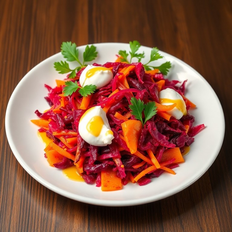 Uma salada vibrante e refrescante, combinando a doçura da beterraba e da cenoura com a cremosidade do requeijão e um toque cítrico do molho de limão. Ideal para acompanhar pratos principais ou como uma entrada leve.