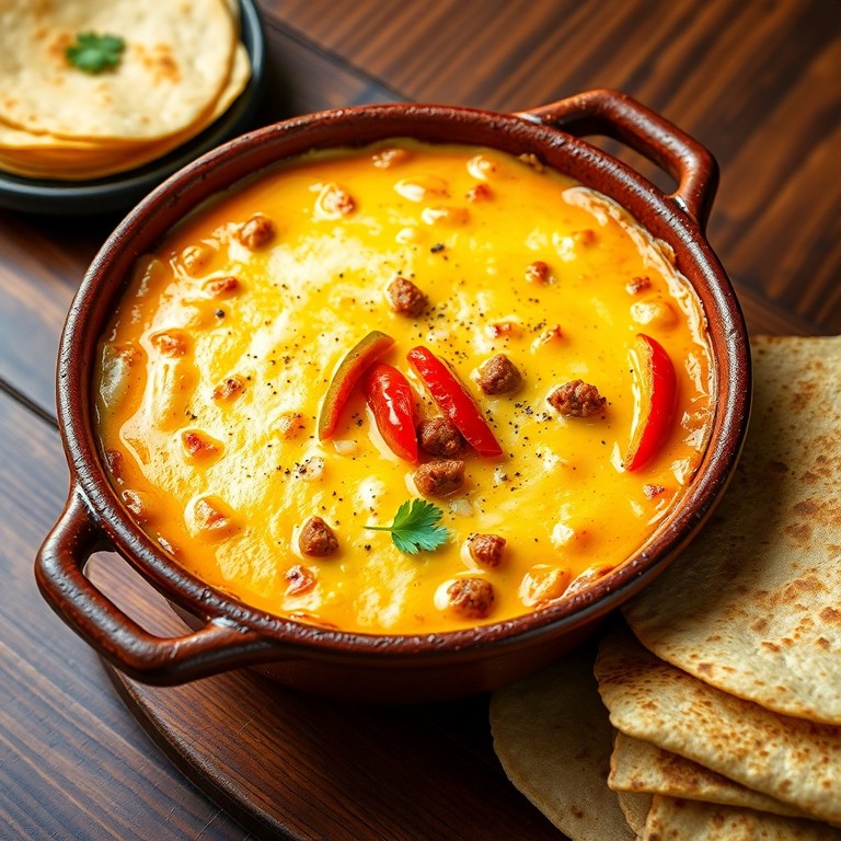 Deliciosa combinación de queso fundido, chorizo y pimientos asados, perfecta para un aperitivo con sabor mexicano. Este plato ofrece una mezcla irresistible de quesos fundidos con el toque picante y aromático del chorizo y la frescura de los pimientos, ideal para compartir en reuniones o como botana.