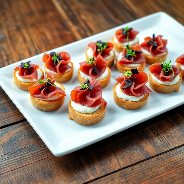 Pequeñas delicias con base de queso crema, jamón serrano y un toque de chocolate para una entrada elegante y original. Estas tostaditas combinan la suavidad del queso crema con el sabor intenso del jamón serrano y el contraste dulce-amargo del chocolate negro, creando un bocado único y sofisticado.