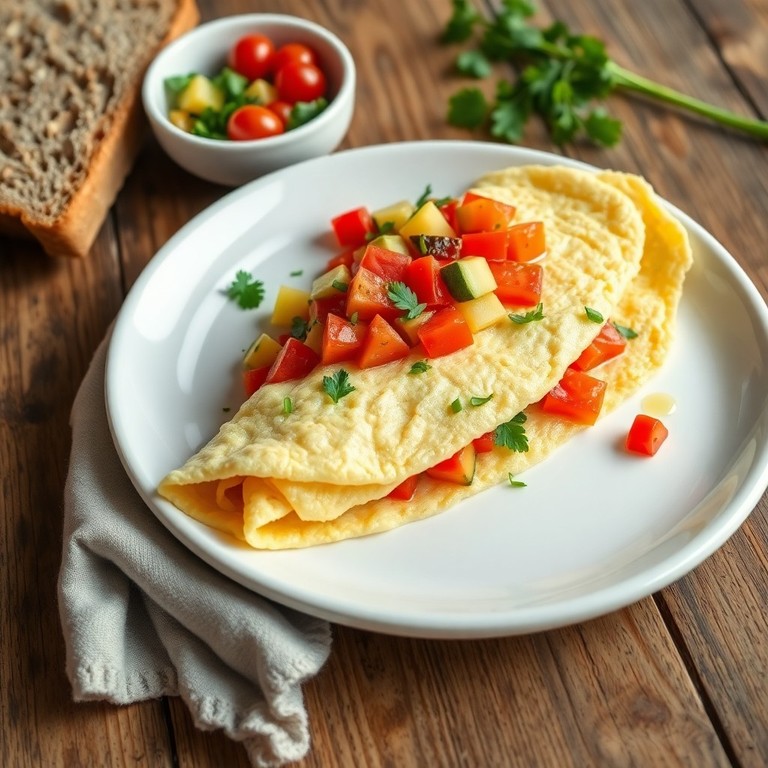 Omelete de claras enriquecidas com legumes frescos e ervas aromáticas, ideal para um café da manhã leve, proteico e rápido de preparar.