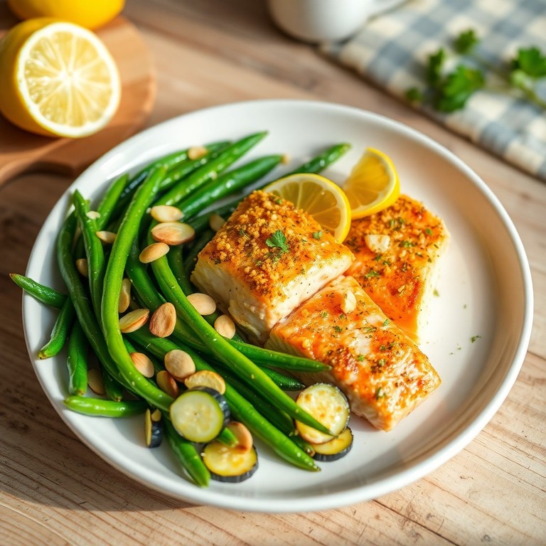 A light and flavorful baked salmon dish seasoned with fresh herbs and lemon, paired with sautéed green beans and zucchini topped with toasted almonds for a delightful crunch. This wholesome dinner balances vibrant vegetables with tender, flaky fish for a healthy and satisfying meal.