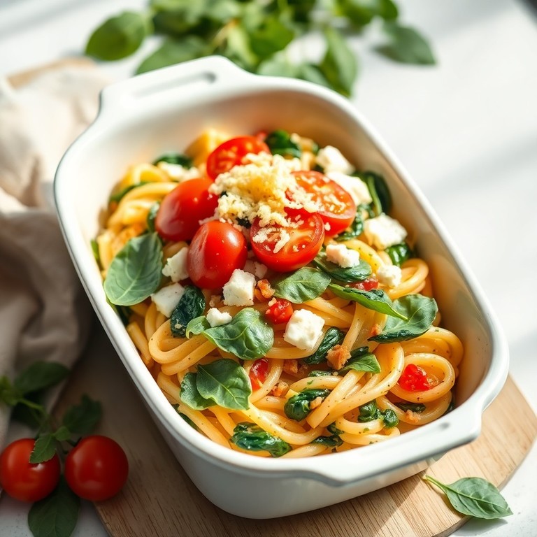 Leichter Schafskäse-Nudelauflauf mit Tomaten und Spinat (390 kcal)