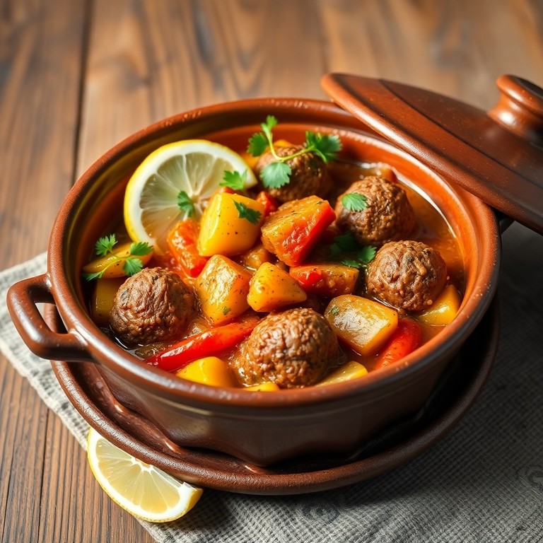 A hearty and aromatic Moroccan-style stew featuring spiced kafta meatballs simmered with a medley of vegetables and traditional herbs, delivering rich flavors and comforting textures in every bite.