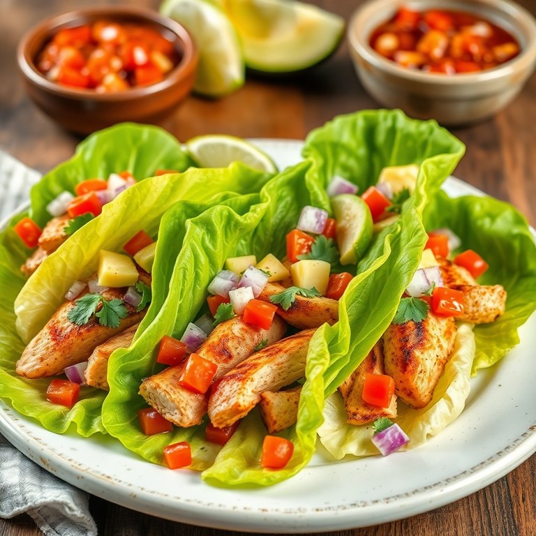 Tacos ligeros y sabrosos usando hojas frescas de lechuga como base y pollo magro a la plancha, acompañados de una salsa fresca de tomate y aguacate. Una cena rápida, baja en calorías y llena de sabor, ideal para quienes buscan una opción saludable y deliciosa.