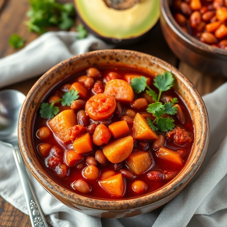 Ein würziger, veganer Bohneneintopf mit Kidneybohnen, passierten und gehackten Tomaten, Kartoffeln, Mais, Paprika und Karotten. Das Gericht ist herzhaft, aromatisch und perfekt für kalte Tage geeignet.