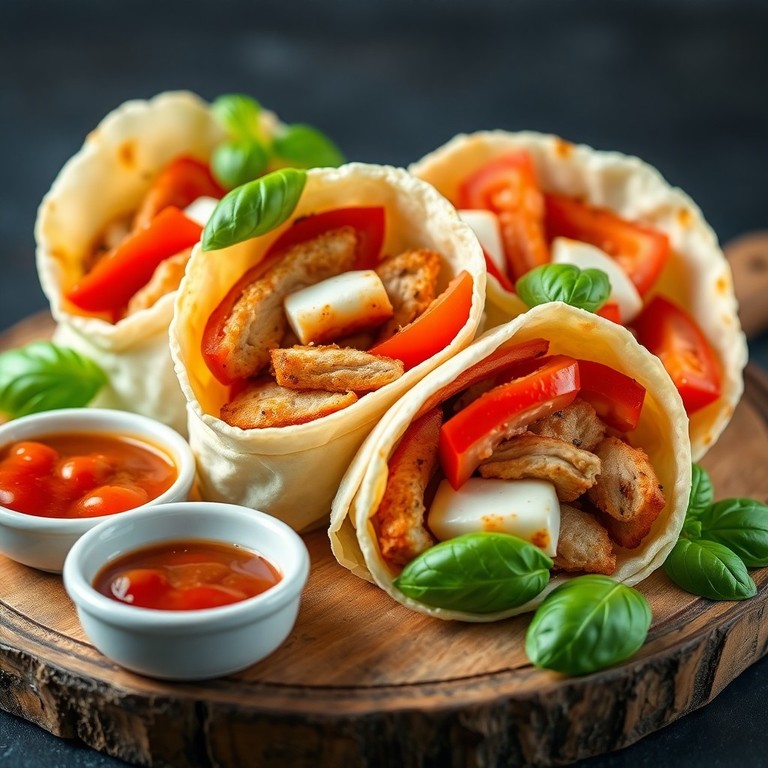 Saftige Hähnchenbrustfilets werden mit Knoblauch und Gewürzen mariniert, gebraten und zusammen mit frischen Tomaten und Mozzarella in Weizen-Wraps eingerollt. Abgerundet mit einer würzigen Tomaten-Ketchup-Senf-Sauce entsteht so ein schneller, leckerer Genuss, perfekt für ein unkompliziertes Mittag- oder Abendessen.