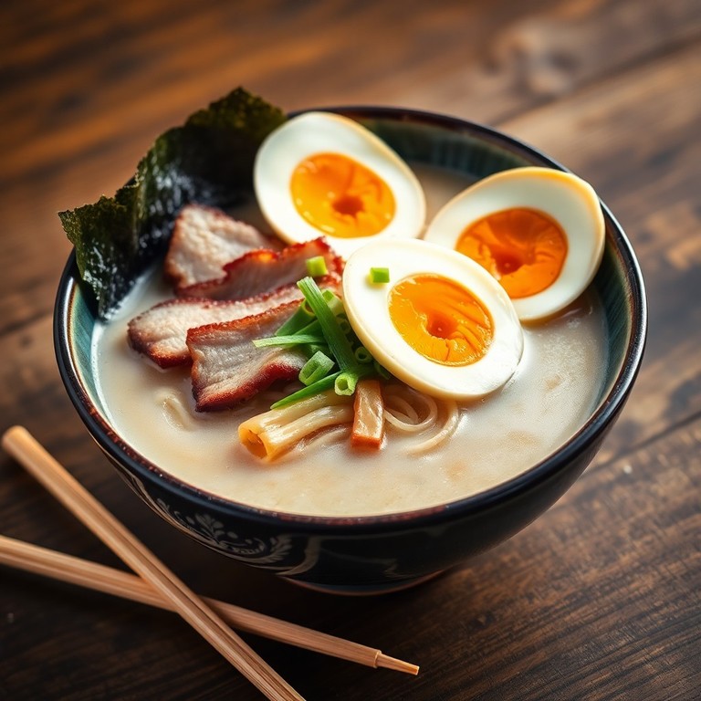 Classic Tonkotsu Ramen features a rich, creamy pork bone broth simmered for hours to achieve its signature milky texture. Tender chashu pork belly, soft-boiled eggs with custardy yolks, and chewy ramen noodles come together for an authentic Japanese experience. Garnished with green onions, nori, and optional pickled bamboo shoots, this dish is perfect for a comforting meal.