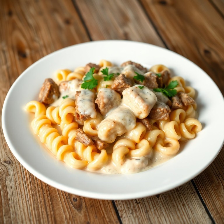 Um prato reconfortante que combina tiras suculentas de carne bovina com macarrão parafuso envolto em um molho cremoso feito com creme de leite e leite. Fácil e rápido de preparar, perfeito para uma refeição saborosa em menos de 30 minutos.