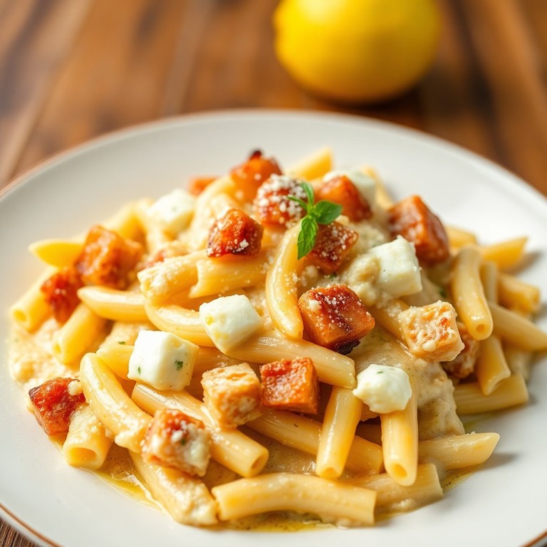 Cremige Hüttenkäse-Pasta mit Speckwürfeln