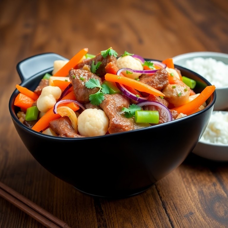 Un plato rápido y nutritivo de estilo stir-fry que combina carne de res con verduras frescas como repollo, zanahoria, cebolla, apio y coliflor. Sazonado con salsa de soja, jengibre y ajo, este salteado asiático es ideal para un almuerzo delicioso y saludable preparado en minutos.