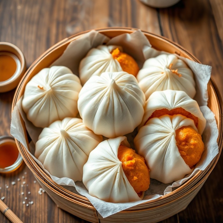 Soft, pillowy steamed Chinese bao buns filled with a sweet and warmly spiced pumpkin mash. These buns offer a unique and delightful side dish or snack with a perfect balance of fluffy dough and rich pumpkin sweetness, inspired by traditional Chinese flavors.