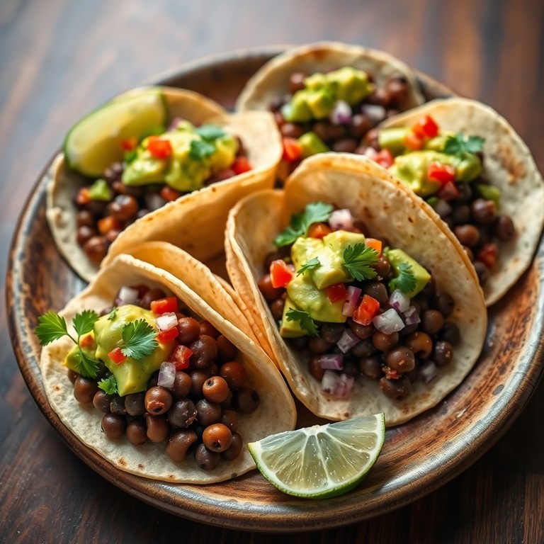 A fusion dish combining flavorful, spiced black chana (black chickpeas) served in soft tortillas and topped with a creamy, zesty avocado salsa. This vibrant recipe offers a satisfying vegetarian taco option with rich Indian-inspired flavors and fresh Mexican-style toppings.