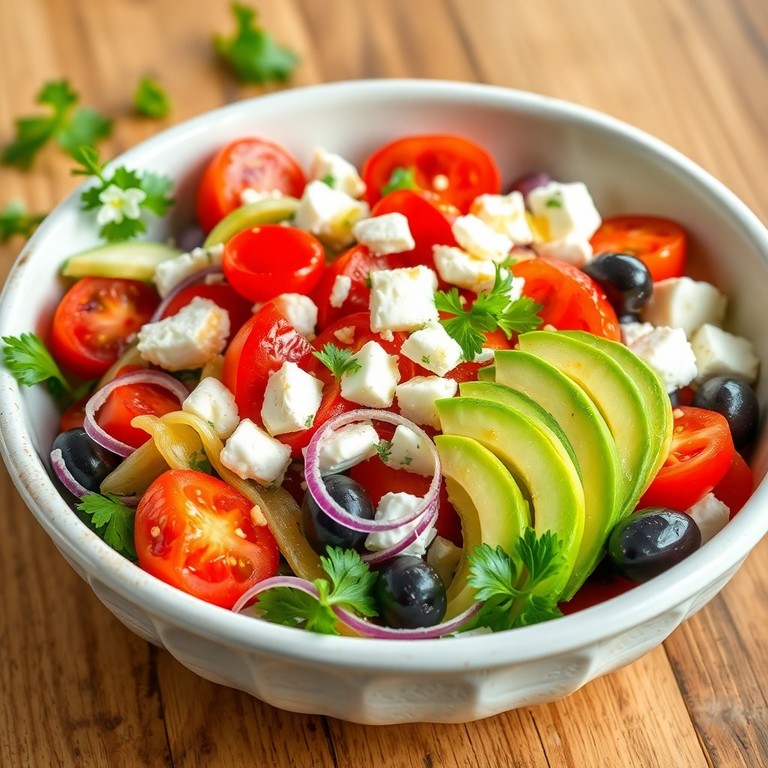 Ein frischer mediterraner Gemüse-Salat mit roten Zwiebeln, saftigen Tomaten, knackigem Kohlrabi und cremiger Avocado, verfeinert mit einem Dressing aus Olivenöl, Zitronensaft und einem Hauch Honig. Abgerundet wird der Salat durch zerbröselten Feta und schwarze Oliven, was ihm eine harmonische Balance aus Frische und herzhaftem Geschmack verleiht. Ideal als leichte Mahlzeit oder als Beilage zu gegrilltem Fleisch oder Fisch.