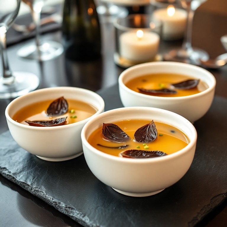 Un caldo aromático y refinado elaborado en menos de 30 minutos, que combina la delicadeza de la carne de cerdo con el lujo de la trufa negra. Ideal para una entrada elegante y rápida, este consomé destaca por su transparencia y sabor intenso, decorado con finas láminas de trufa para un toque gourmet.