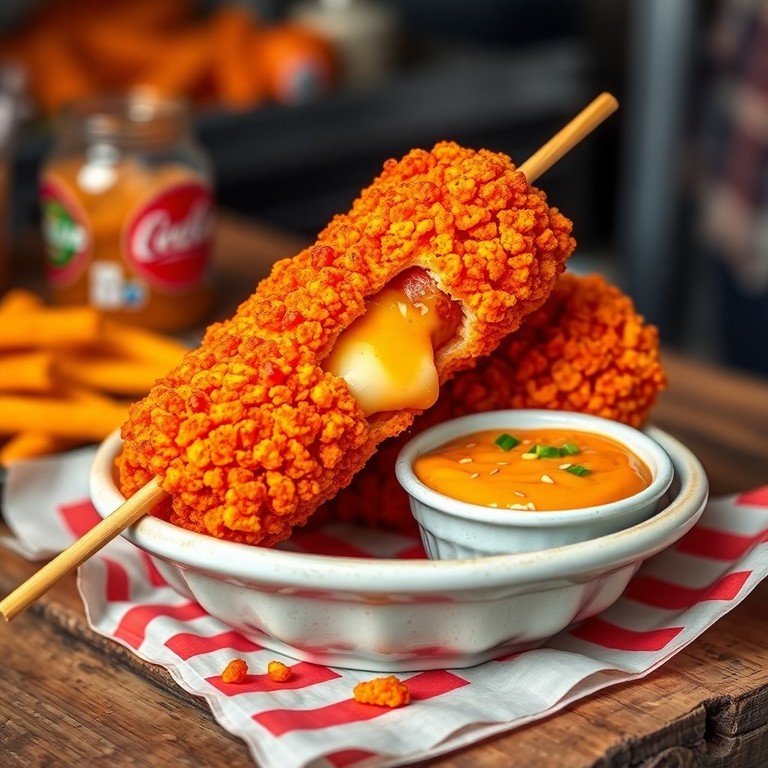 A crunchy, cheesy snack with a spicy kick, featuring a classic Korean street food style sausage and mozzarella cheese coated in a vibrant Flamin' Hot Cheetos crust, served with a spicy-sweet gochujang mayo dipping sauce.
