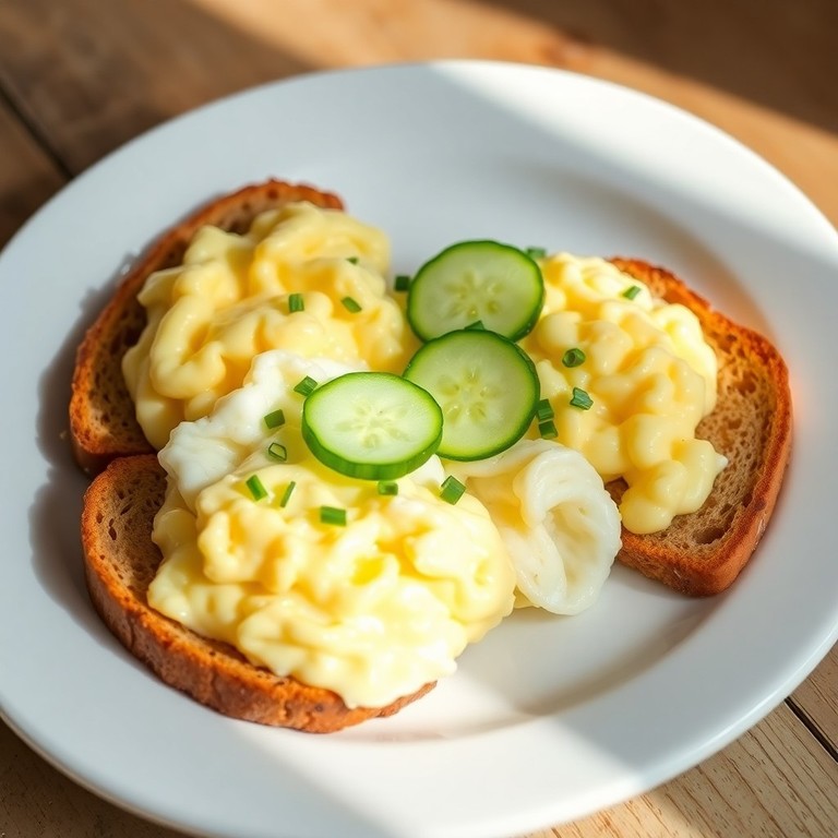 Crispy whole grain toast topped with soft scrambled eggs and fresh cucumber slices creates a refreshing and satisfying breakfast. This simple yet elegant dish combines the creamy texture of eggs with the cool crunch of cucumber, enhanced by subtle seasoning and fresh chives for a bright start to your day.