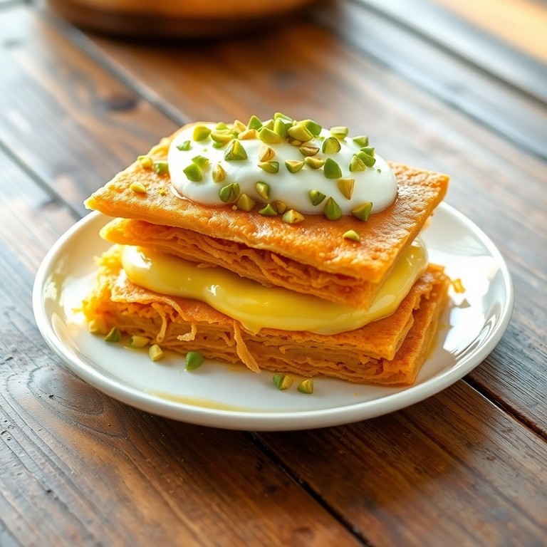 This traditional Middle Eastern dessert features layers of crunchy kunafa dough enveloping a luscious pistachio custard, topped with fresh cream for a delightful balance of textures and flavors. The golden, crispy exterior contrasts beautifully with the smooth, rich filling, making it a perfect treat for special occasions or an indulgent everyday dessert.