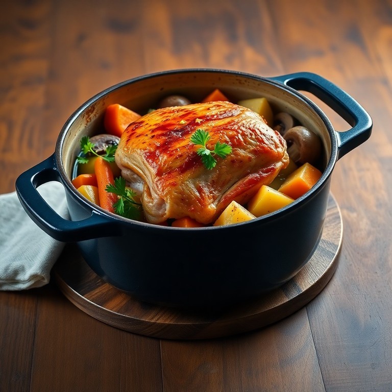 Un plat mijoté réconfortant mettant en valeur un rôti de dinde tendre accompagné de légumes d'automne savoureux. Cette recette combine la douceur des carottes, la richesse des champignons et la texture fondante des pommes de terre, le tout mijoté lentement pour un dîner chaud et nutritif parfait pour les soirées fraîches.