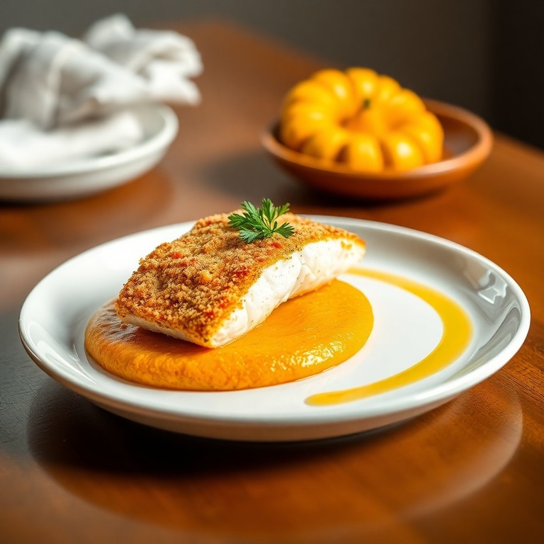 Filete de Pescado en Crosta de Pancko y Hierbas con Puré de Calabaza Asada