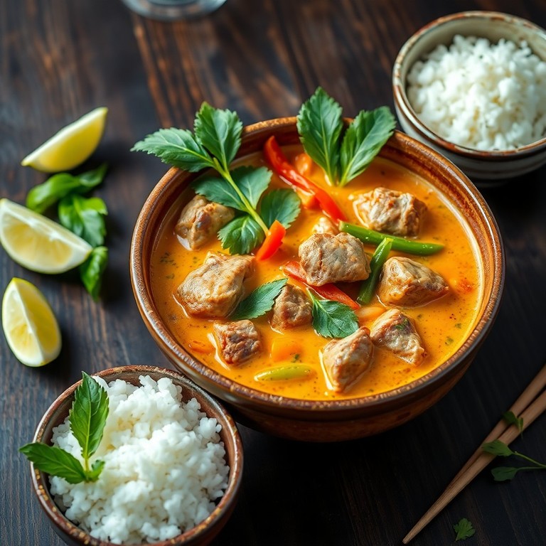 A creamy and mildly spicy Thai beef curry featuring tender beef simmered in rich coconut milk infused with aromatic herbs and spices. This dish balances the sweetness of coconut milk with the warmth of curry paste and fresh herbs, delivering a comforting yet vibrant flavor in a quick cooking time. Perfect served over jasmine rice for an authentic Thai meal experience.