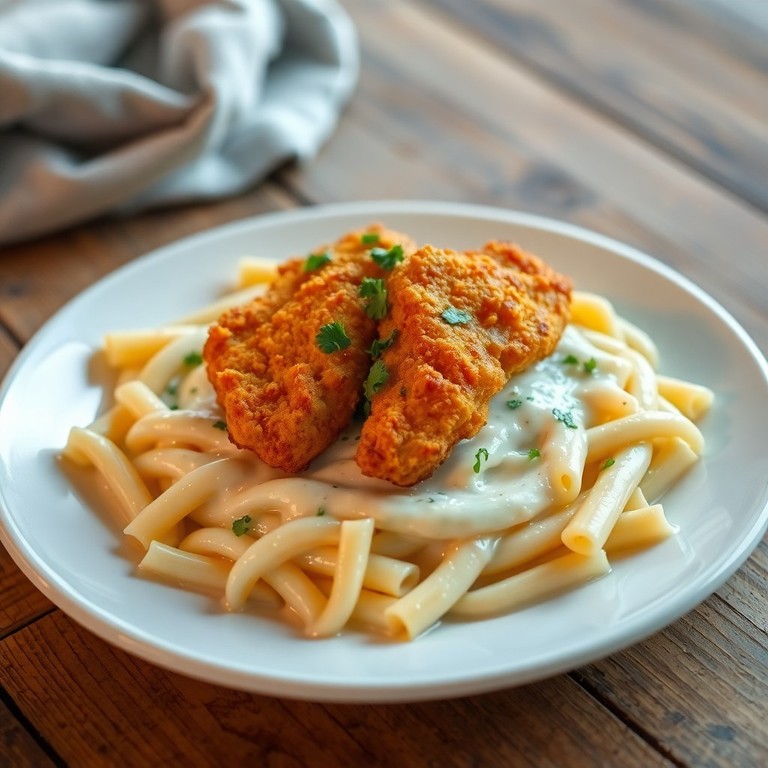 Um prato clássico e reconfortante que combina macarrão envolvido em um molho branco cremoso e queijo derretido, acompanhado de pedaços de frango empanado crocante. Perfeito para um almoço especial, essa receita traz texturas contrastantes e sabores harmoniosos que agradam toda a família.