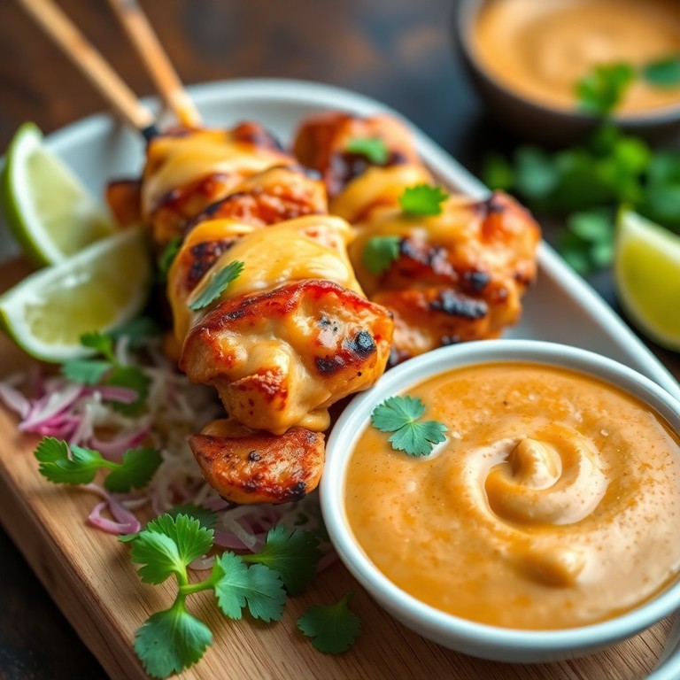 Grilled chicken skewers marinated in a vibrant peanut sauce, enhanced with melted cheese for a creamy twist on the classic Thai satay. This delicious fusion dish combines tender chicken with spicy, nutty flavors and gooey cheese, perfect as an appetizer or main course.