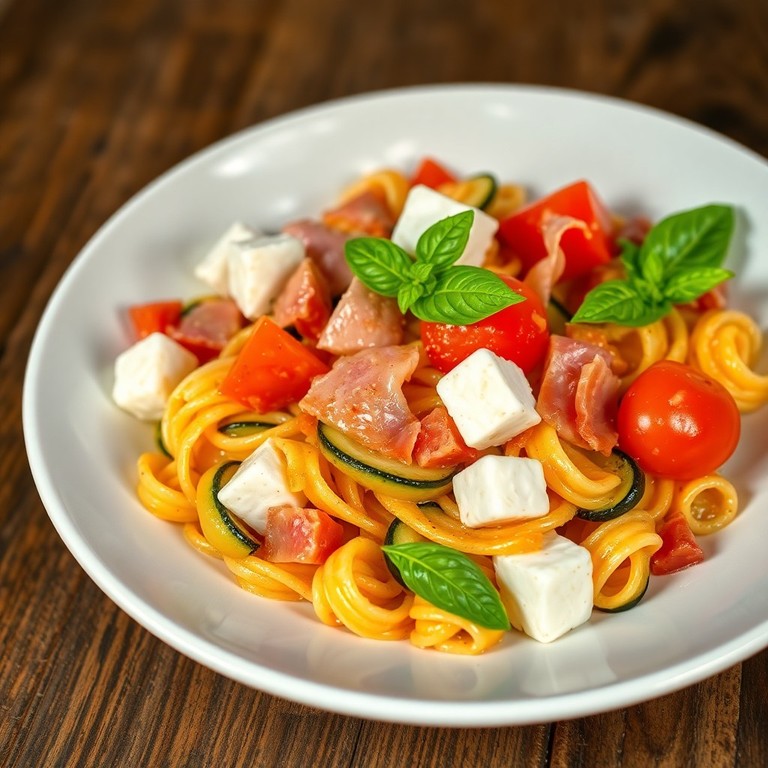 Pâtes sautées aux tomates, jambon et courgettes