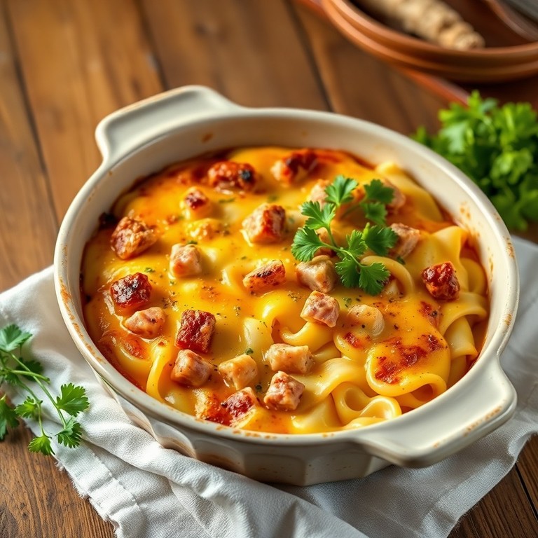 Ein herzhafter, im Ofen gebackener Auflauf mit zarten Nudeln, würzigen Schinkenwürfeln und einer cremigen Eiersoße. Perfekt als Familiengericht, das einfach zuzubereiten ist und Groß und Klein begeistert. Die goldbraune Kruste und der aromatische Duft machen diesen Auflauf zu einem echten Wohlfühlessen.