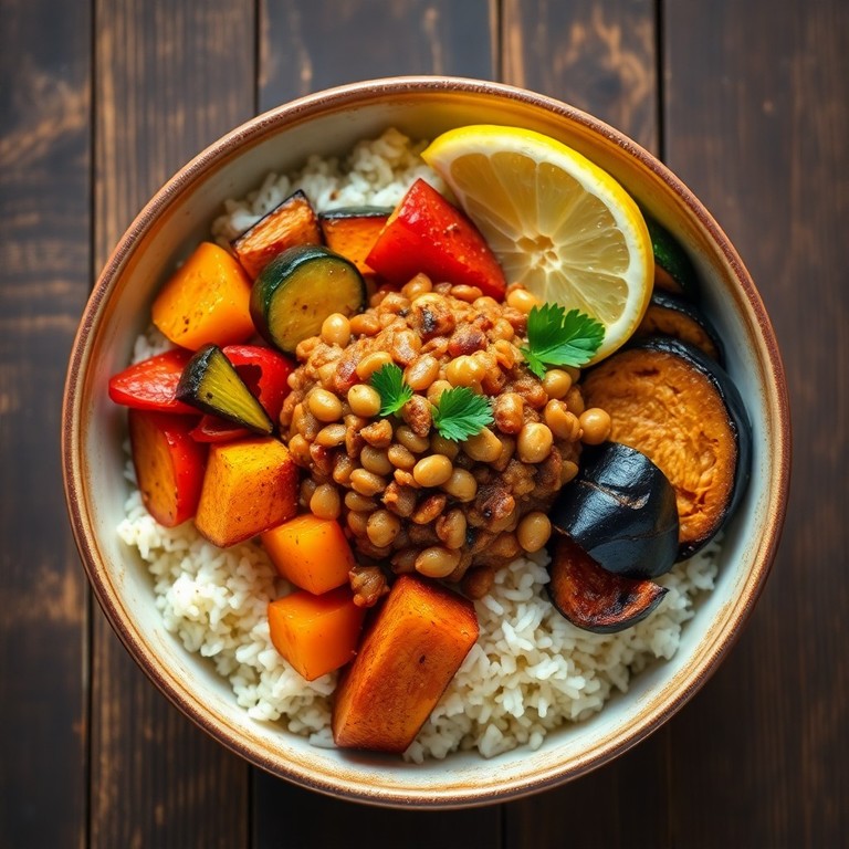 Diese gesunde, proteinreiche Bowl kombiniert aromatischen Basmatireis mit einem würzigen Topping aus roten Linsen und Kichererbsen. Dazu kommt bunt geröstetes Gemüse, das für Geschmack und Vitamine sorgt. Perfekt für eine schnelle, nahrhafte Mahlzeit, die lange satt macht und voller pflanzlicher Proteine steckt.