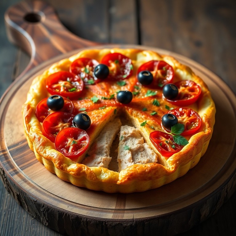 A traditional savory tart featuring flaky pastry topped with a flavorful mixture of tuna, ripe tomatoes, olives, and aromatic herbs. This quick-to-prepare Spanish-inspired snack combines a crisp, buttery crust with a vibrant, savory filling, perfect for an appetizer or light meal.