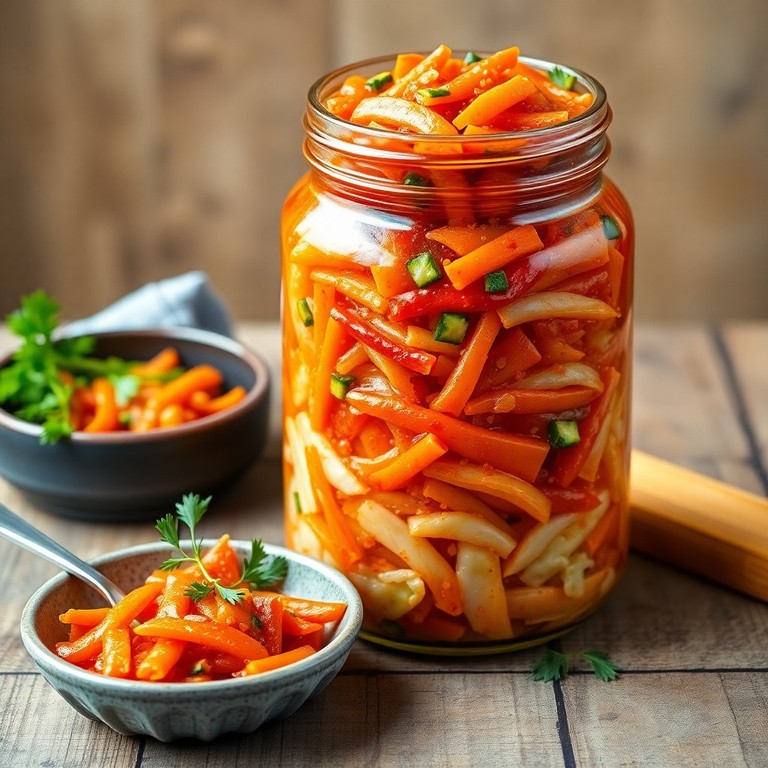 A quick and simple fermented vegetable side dish featuring crunchy cabbage and carrot, infused with the bright flavors of ginger and garlic. This kimchi offers a tangy, refreshing crunch perfect for complementing a variety of meals. Using common kitchen ingredients, it’s an accessible introduction to homemade kimchi with a balanced flavor profile.