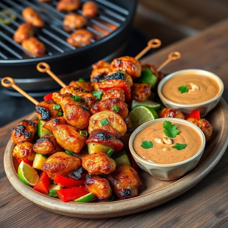 Saftige Hähnchenspieße, mariniert in einer aromatischen Mischung aus Sojasauce, Ingwer und Knoblauch, werden auf Grillring und Rost perfekt gegrillt. Dazu gibt es eine cremige, würzige Erdnusssauce mit Limette und Chili. Ideal als Teil eines asiatisch inspirierten Grillmenüs – einfach zuzubereiten und voller Geschmack.