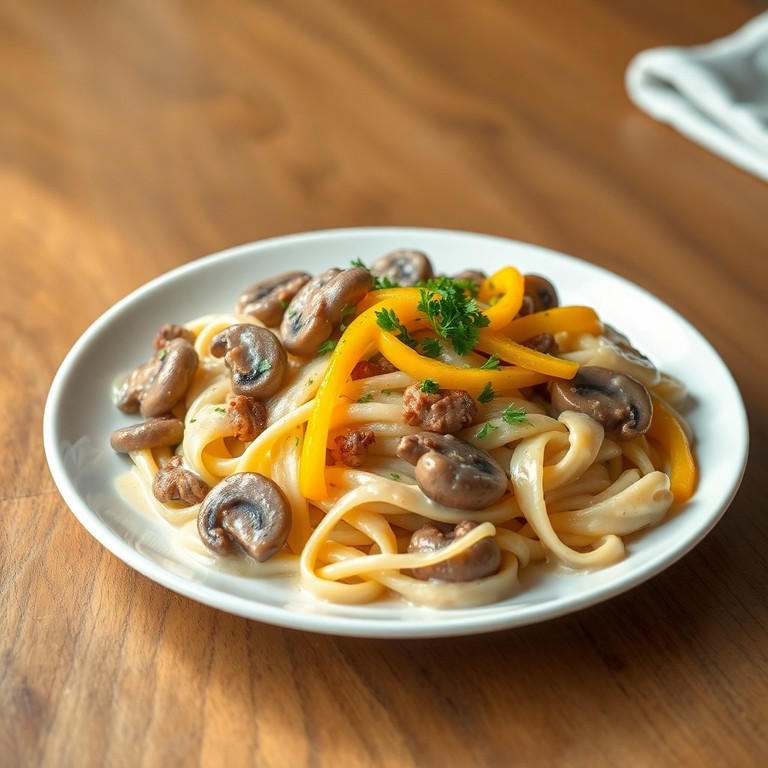 Простое и вкусное блюдо, которое сочетает нежную говядину, ароматные шампиньоны и сладкий жёлтый перец в нежном сливочном соусе. Идеально подходит для быстрого обеда или ужина, используя доступные продукты из небольшого супермаркета. Готовится всего за 30 минут, сохраняя насыщенный вкус и аппетитный внешний вид.