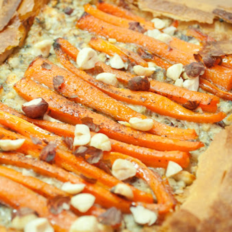 Golden-glazed carrot, mushroom & hazelnut tart