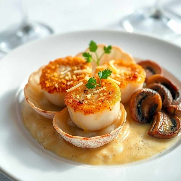 Un plat élégant et raffiné qui marie la douceur des noix de Saint-Jacques avec la richesse du parmesan en croûte, accompagné de champignons bruns sautés parfumés à l'ail et aux échalotes. Cette recette met en valeur la finesse des produits de la mer et la gourmandise d'une béchamel onctueuse, idéale pour une entrée festive ou un dîner sophistiqué.