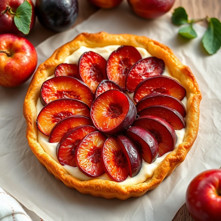 Une variante gourmande de la tarte aux prunes rapide, remplaçant la crème d’amande par une onctueuse crème pâtissière maison. Cette tarte met en valeur la douceur de la crème et l’acidité des prunes, pour une expérience encore plus fondante et savoureuse. Parfait pour les amateurs de desserts fruités et crémeux, sans préparation de pâte nécessaire !