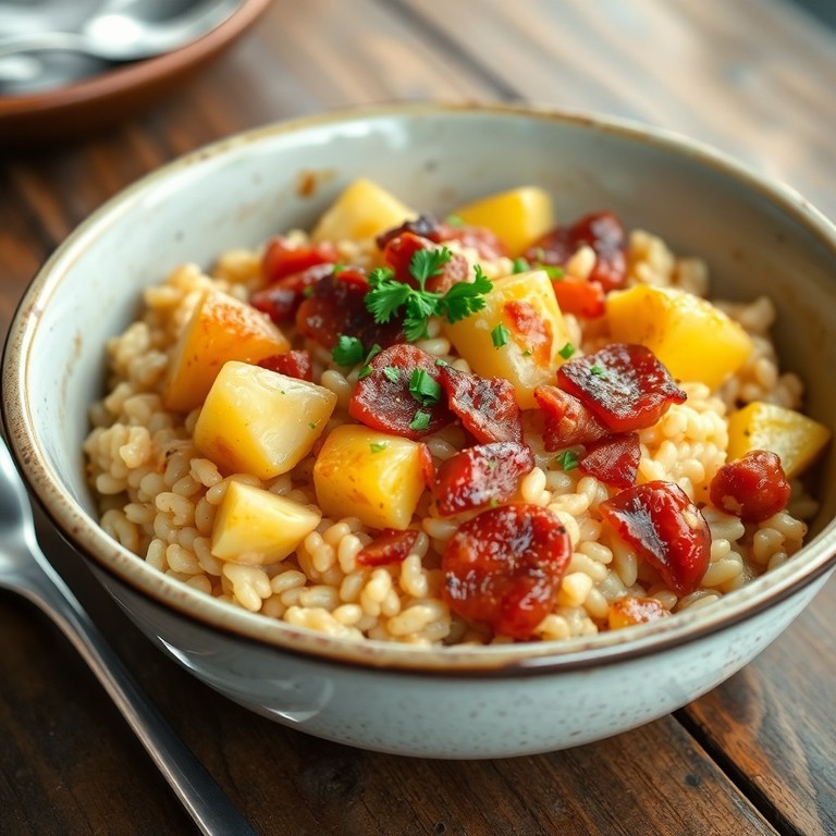 A creamy and comforting risotto that combines the smoky flavors of calabresa sausage and crispy bacon with tender, sautéed potatoes. This dish offers a rich and satisfying flavor profile, perfect for a hearty meal that highlights traditional Brazilian ingredients with an Italian cooking technique.
