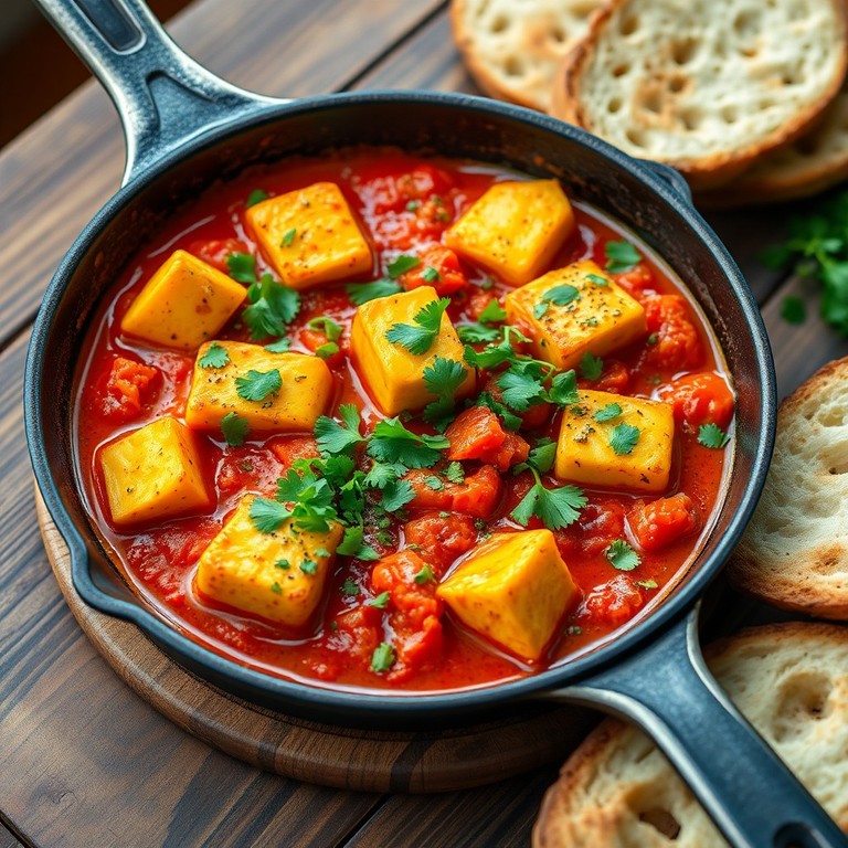 This vibrant vegan twist on the classic Middle Eastern shakshuka replaces poached eggs with protein-rich tofu simmered in a spicy, aromatic tomato and bell pepper sauce. Infused with fresh herbs like parsley and cilantro, this dish offers a hearty, flavorful meal perfect for breakfast, lunch, or dinner. Quick to prepare and packed with nutrients, it's an excellent plant-based option that retains the comforting essence of traditional shakshuka.